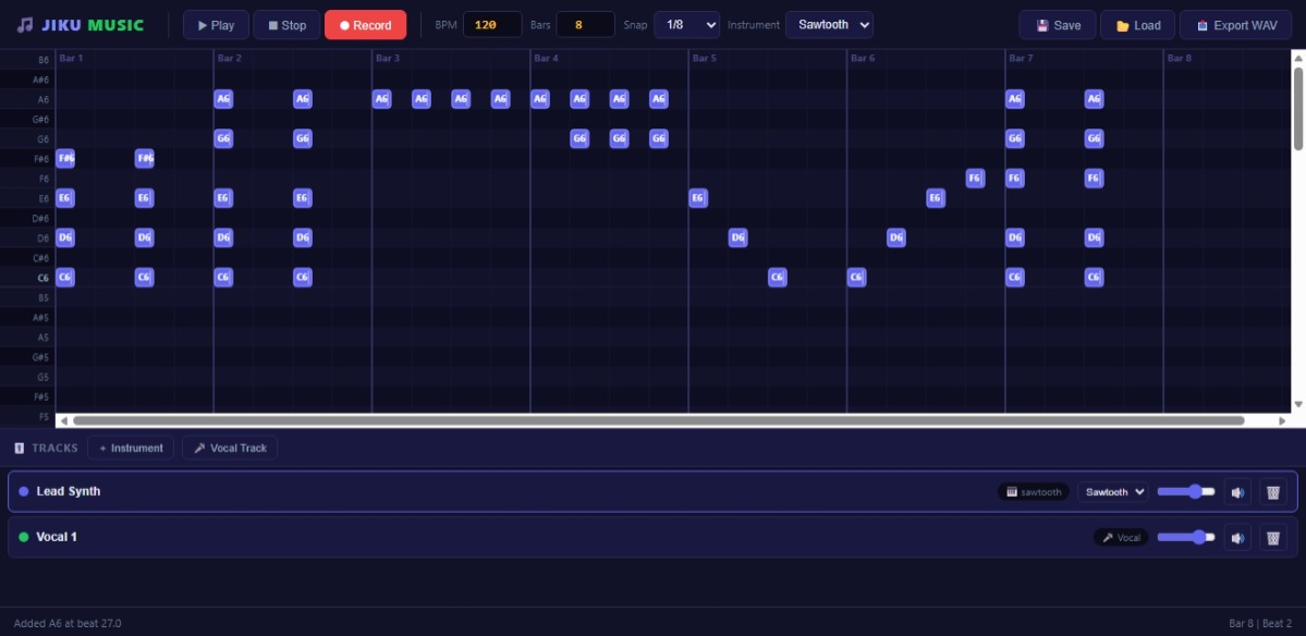When we added vocal recording to Jiku Music, it changed everything. Suddenly, the DAW wasn’t just a sequencer. It was a microphone. It could listen. It could capture. It could remember. We built it using the browser’s native audio capabilities — no plugins, no installs. Just a clean, direct connection to your voice. You click…