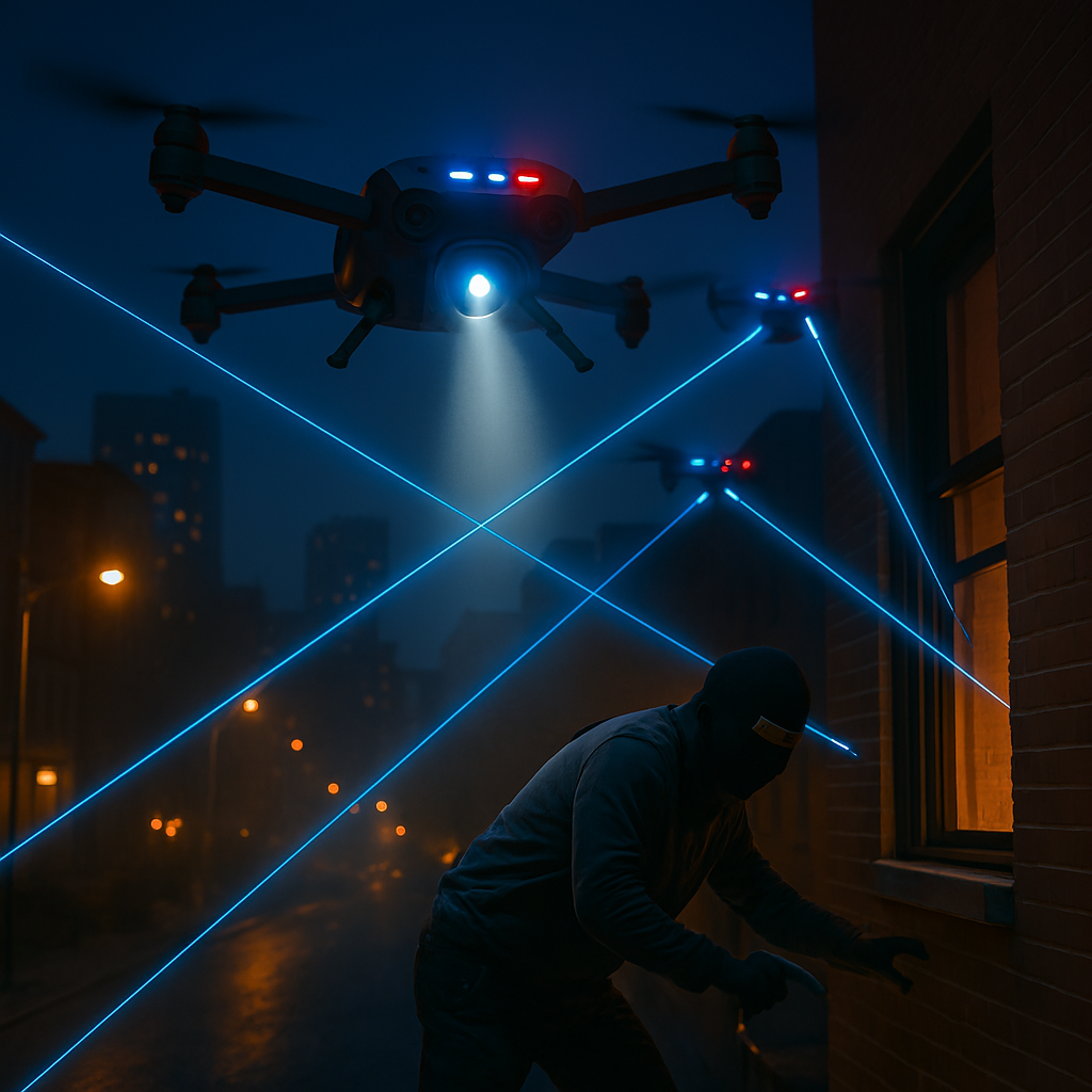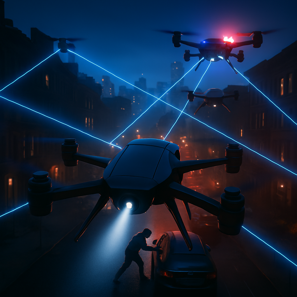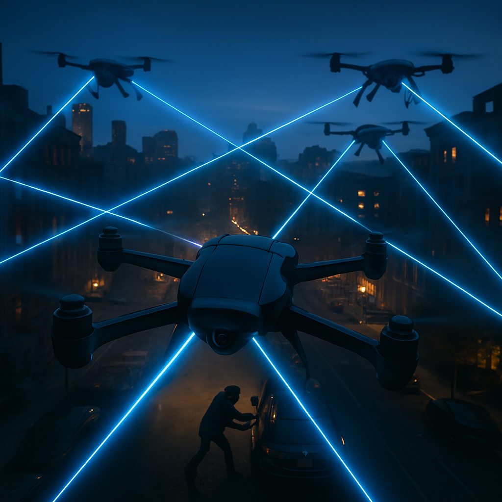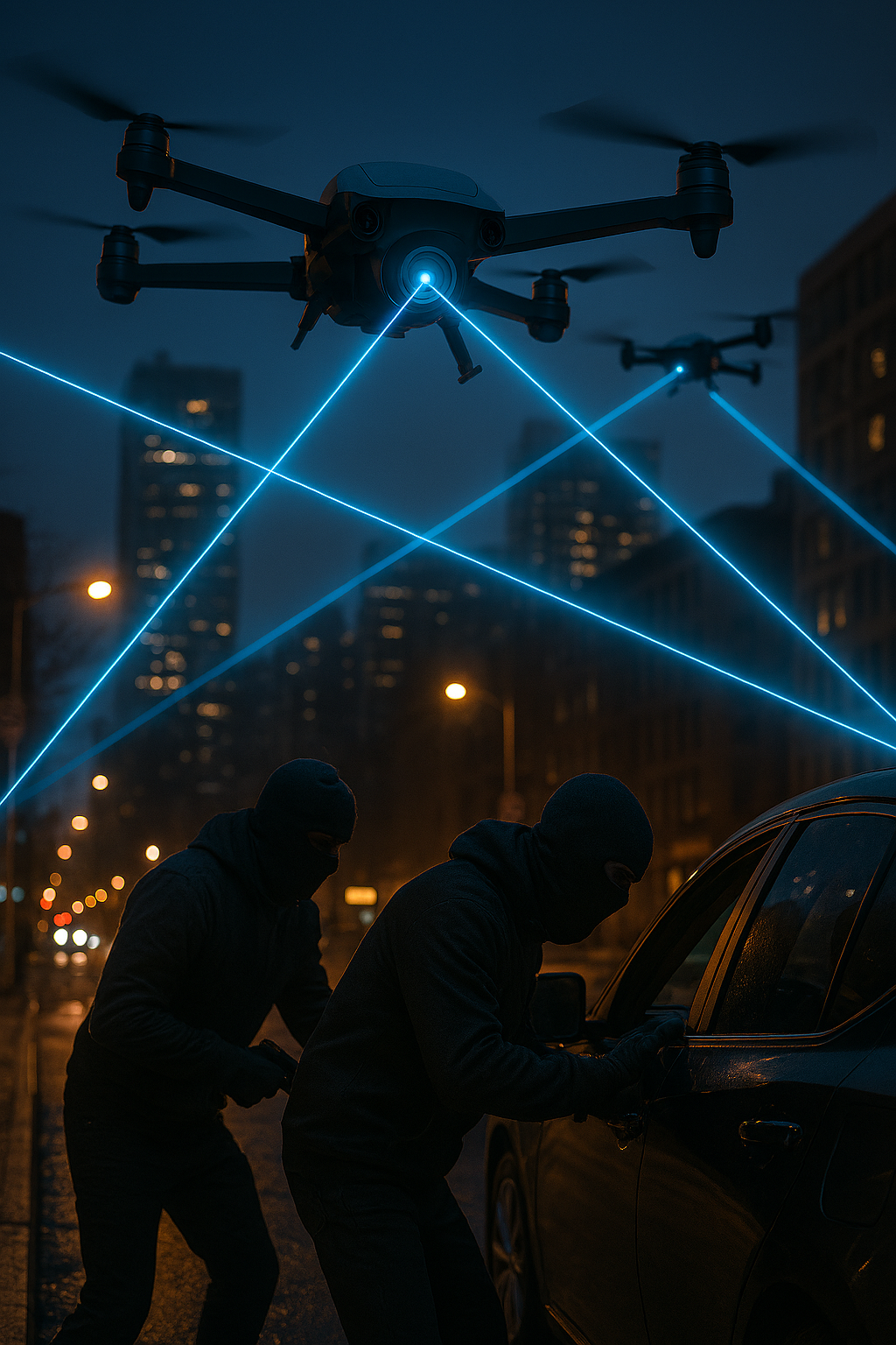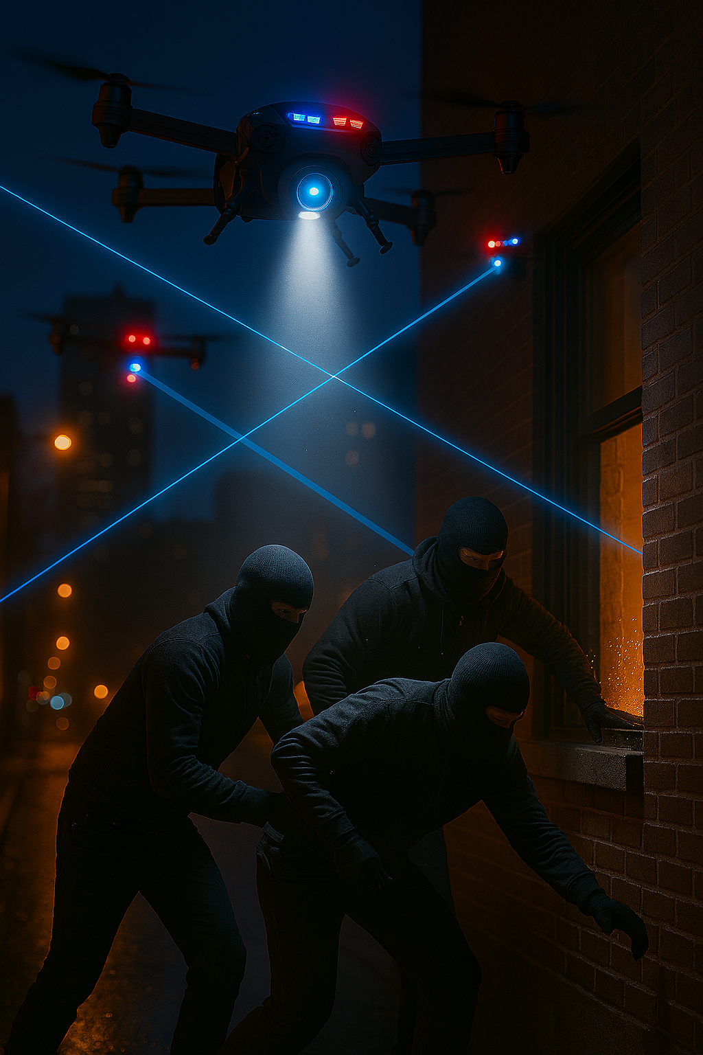 Drones equipped with night vision, thermal optics, and adaptive flight patterns patrol every street, alley, and rooftop—ensuring no blind spots remain.