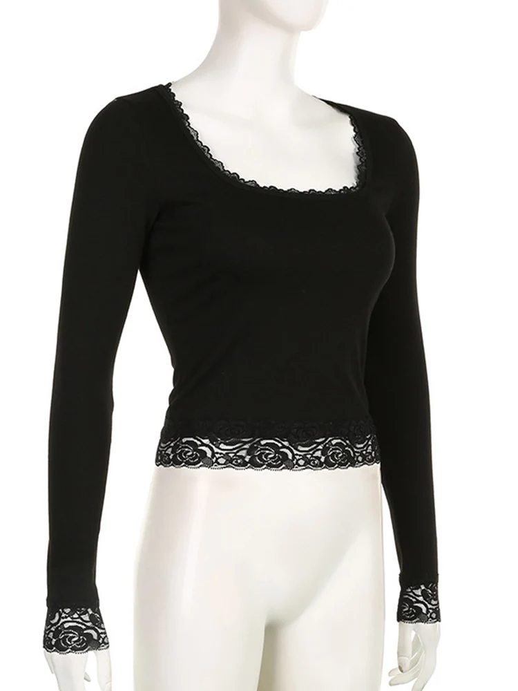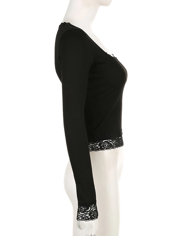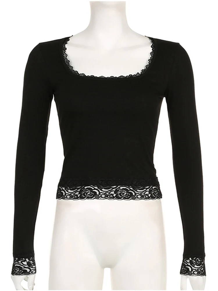 2000s Graphic T Shirt Vintage Fairy Grunge Women Autumn Lace Trim Long Sleeve Slim Fits Tops y2k Clothes Basic Harajuku Tees