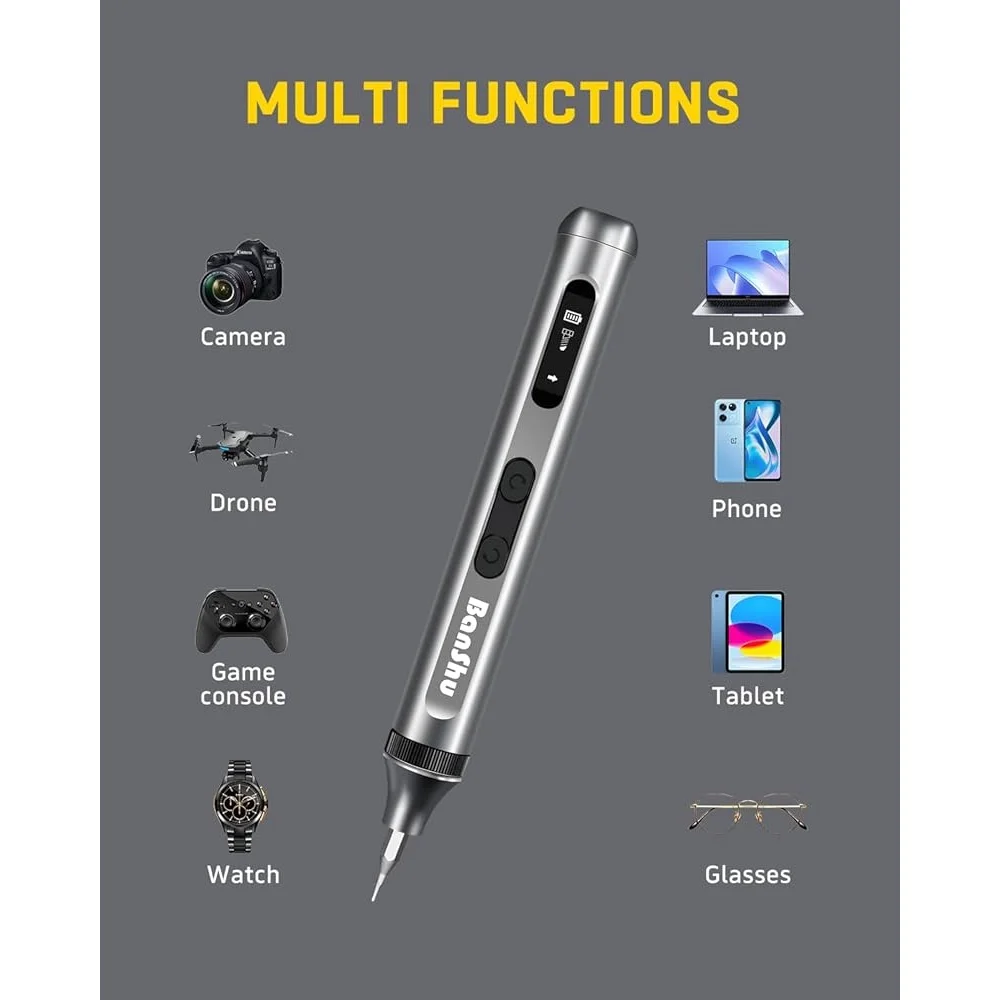 Magnetic design: The body of this multi-purpose electric screwdriver is made of PC+ABS high-strength engineering plastic. The magnetic design can prevent the drill bits from being lost, but also allows you to work in a neat and orderly manner, happy mood. The pry bar and tweezers on both sides can also assist you in your repair work. There is a magnetized area at the bottom of the main body, and the bit is placed on it for 5 seconds to complete magnetization to better absorb precision screws.