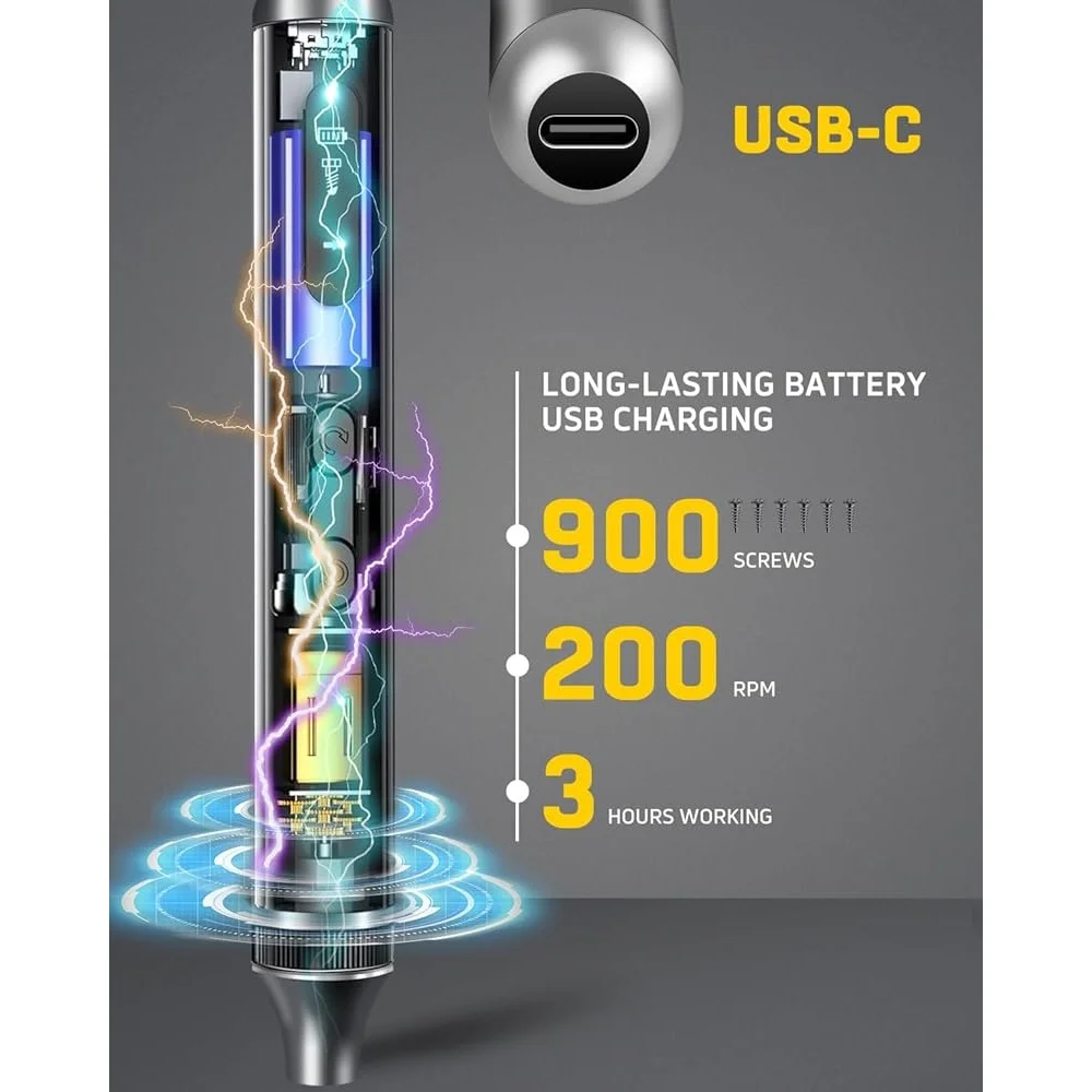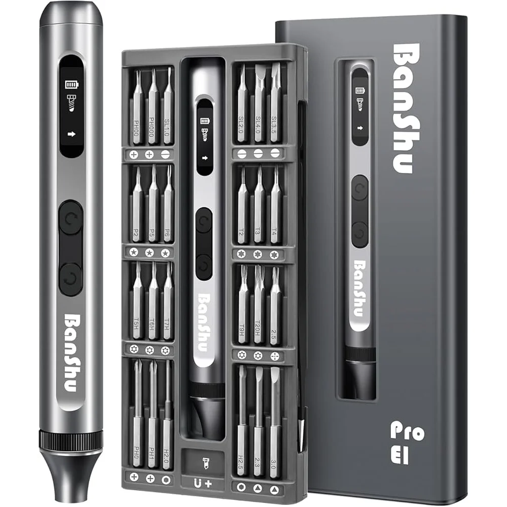 Portability: This mini electric screwdriver set, 0. 936 lb, overall size equivalent to an iphone13. All the accessories are in a box. Lightweight and compact design, easy to put in your pocket or backpack out. Screwdriver pen and aluminum case surface anodized, sweat-resistant and corrosion-resistant. The pen shape using ergonomic design, easy to grip. The frosted aluminum box is highly textured, giving you a delicate touch.