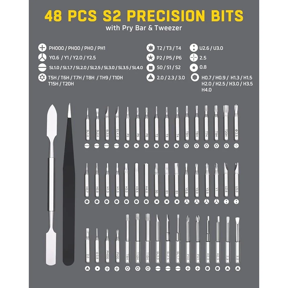 52 IN 1 multi-purpose: electric precision screwdrivers set are equipped with 48 precision steel bits and 12 mainstream types. All screwdriver bits are made of S2 steel with a hardness of 60 HRC. Compared to CR-V, S2 steel has the advantages of high strength, wear resistance and corrosion resistance. Each bit is machined with high precision to avoid damage to the screw. Especially used for precise objects disassembly, such as repairing computers, tablets, iphones, drones, cameras, watches and other electronics.