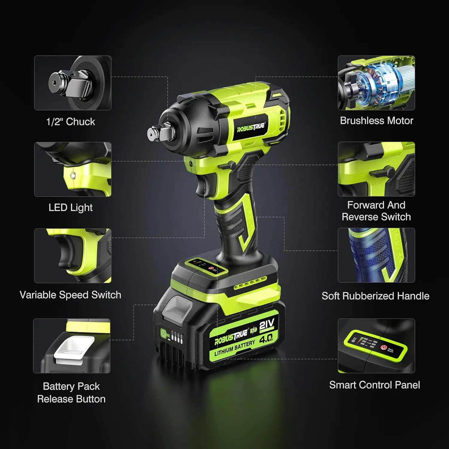 👉【550N.m High Torque & Brushless Motor】Impact wrench delivers a maximum torque of 550N.m, making it the market’s highest torque battery-powered cordless impact wrench. Robustrue power impact wrench effortlessly loosens or tightens various types of bolts or nuts, including removing car tires, assembling furniture, installing scaffolding, garage use, DIY projects, etc.