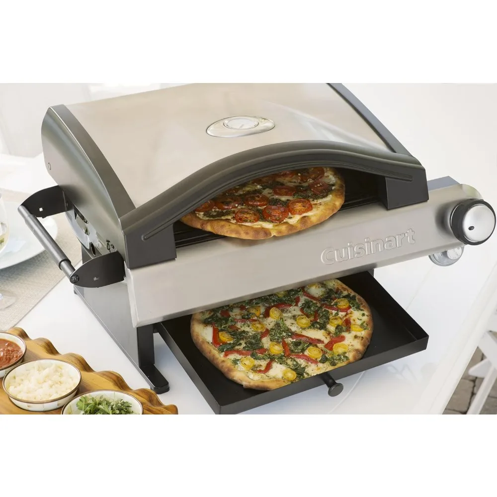 - INCLUDES: The grill also comes with a 12″ Pizza peel, a 13″ Cordierite stone, a warming tray, an integrated smoker cup, and a Cuisinart pizza making guide.