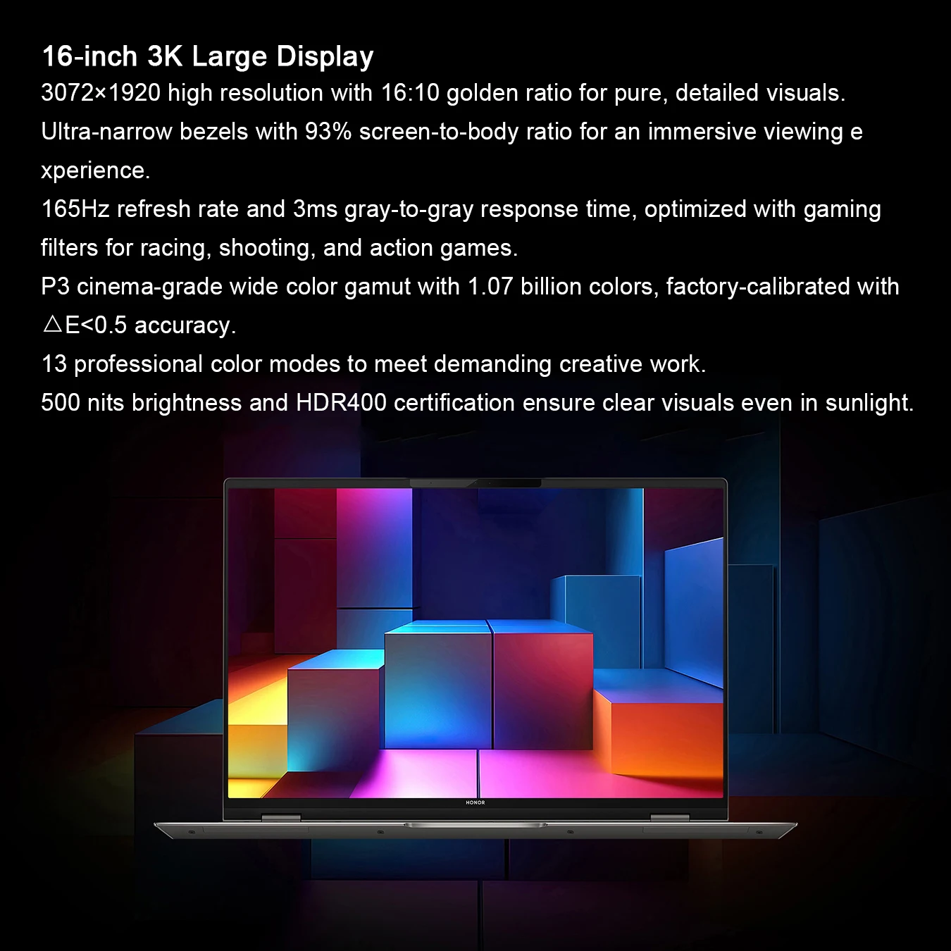 P3 cinema-grade wide color gamut with 1.07 billion colors, factory-calibrated with △E<0.5 accuracy.
