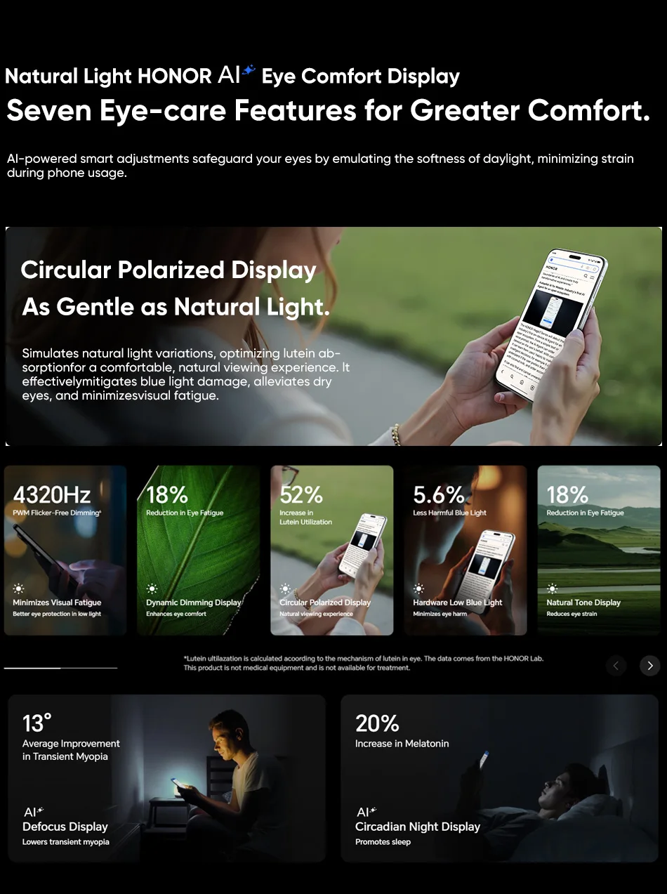 8. Display — Size: 6.8 inches;Resolution: FHD+ 1280 x 2800; Type: OLED; Color: 1.07 billion colors; HDR Peak Brightness: 5000 nits, Global Peak Brightness: 1600 nits; Gestures: supported; Screen Glass Material: HONOR NanoCrystal Shield.