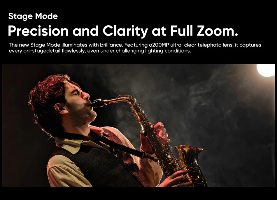 5. Rear camera — 50MP Wide Main Camera (f/1.4-f/2.0, OIS) + 50MP Ultra Wide Camera (f/2.0) + 200MP Telephoto Camera (f/2.6, 3x Optical Zoom, 100x Digital Zoom, OIS), Support for 4K 60fps (3840×2160) video recording, Image Resolution: 16384 x 12288 pixels. Video resolution: 3840 × 2160 pixels. Zoom Mode: 3x Optical Zoom, 100x Digital Zoom. Stabilization Mode: EIS+OIS.Rear Flashlight: Rear single LED flash. Capture Mode: HD Super Burst, AI Enhanced Portrait, AI Super Zoom, Stage Mode,Motion Sensing Capture, Smart Focus, Movie, Multi-video, AI photography, High RES, Time-lapse, Super Wide Angle, Aperture, Night, Super Macro, Portrait, Pro, Slow-MO, Panorama, Filter, Watermark, Capture smiles, Video, Timer, Scan Document, Story, Light Painting, HDR.