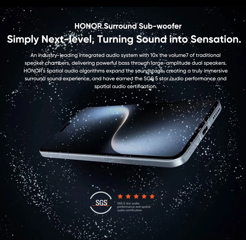 13.Other — Sound Effect: DTS:X® Ultra sound effects; Stereo: HONOR Surround Subwoofer; Water and Dust Resistance: supported(IP68 and IP69); USB: Type-C, USB 3.2 GEN1;Earjack: USB Type-C.