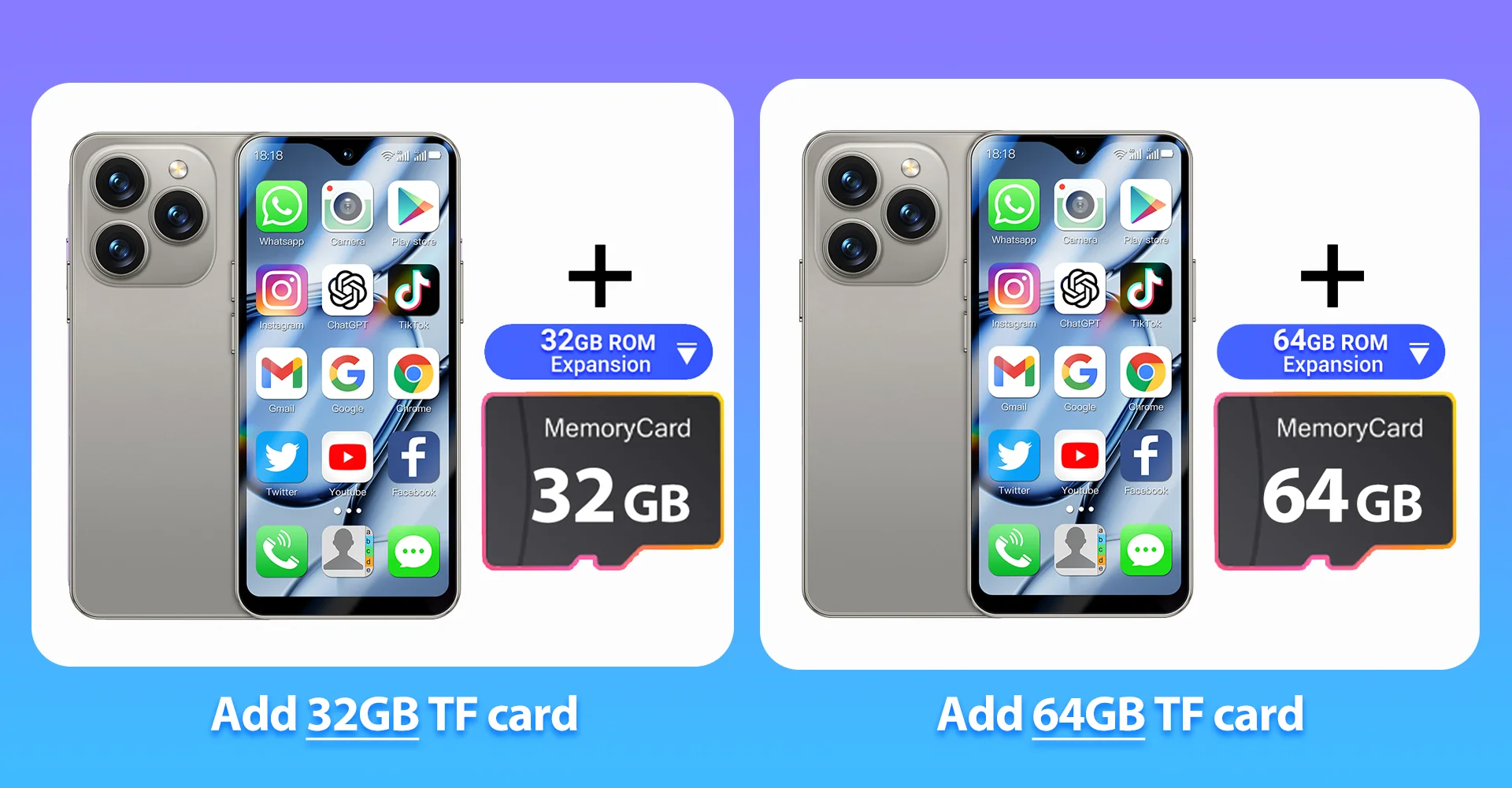 * With 64G TF card = 1*Phone+1*USB cable+1* Manual+1*Display protector+1*Phone case+1* 64G Memory card